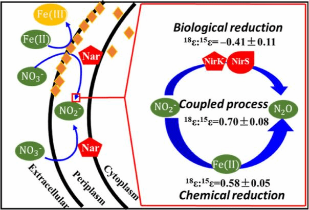 近日,我院陈丹丹副教授作为共同第一作者,联合广东省科公司生态环境与土壤研究所等单位合作在环境领域国际顶级期刊《Environmental Science & Technology》(中科院1区top期刊,影响因子10.9)上发表题为“Novel insight into microbially mediated nitrate-reducing Fe(II) oxidation by Acidovoraxsp. strain BoFeN1 using dual N−O isotope fractionation”的研究论文。