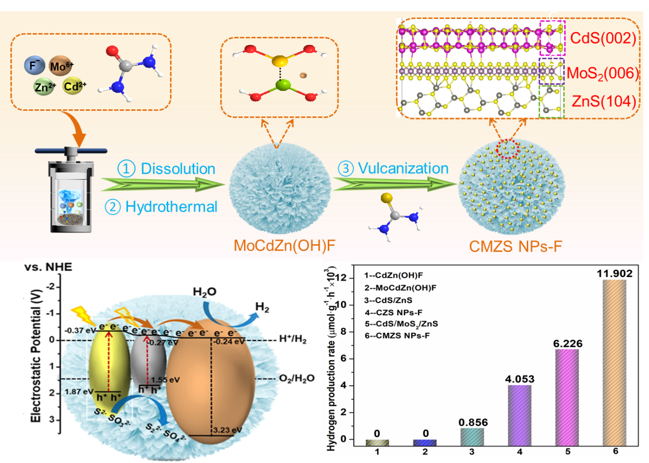 近日,我院杨海燕博士作为第一作者,yl23455永利集团为第一单位在工程技术领域国际著名期刊《Separationand Purification Technology》(中科院1区top期刊)上发表题为“Steppedfluorinated CdS/MoS2/ZnS nanoparticles constructed on amultifunctional platform with Zn(OH)F nanoflowers for highly activephotocatalytic H2 production”的研究论文。