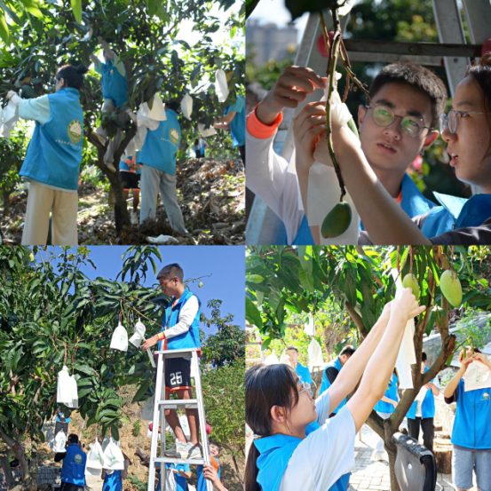 在工作人员的讲解下,同学们开始了“芒果套袋之旅”。起初,同学们对于给芒果套袋的技术活略显生涩,但经过多次的实践让他们熟练并掌握,大家相互帮助,对芒果进行清理、套袋和封口。经过大家一个半小时的共同努力,果园里30多棵芒果树都挂满了白茫茫的果袋。