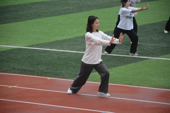 “向左开步,两手平提,曲膝下按……”21个班级按照抽签顺序依次上场表演太极24式,一招一式,一张一弛,参赛同学精神饱满,在表演间展现太极拳的舒展大方、急缓相间。评委根据团队服装整齐度、精神面貌、动作标准度、流畅度进行打分。