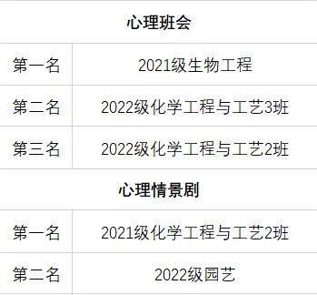 活动主要以心理班会和心理情景剧两种形式开展,班级可根据自身情况选择参加其中的一个活动。本次比赛班会的主题涵盖大学适应、人际交往、时间管理、恋爱人际、情绪管理等多个方面,内容丰富、形式多样,除了知识讲解外,还加入暖场游戏、心理短剧、心理测试、心理视频等各种形式的活动,为心理主题班会增添不少色彩。最终,通过激烈角逐,根据现场评委打分,选出了获奖的班级: