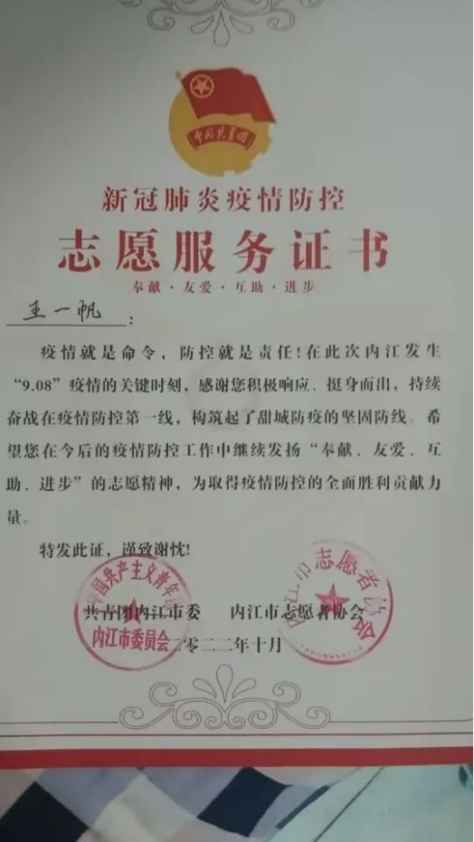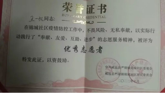 王一帆,高宏雨,肖箫等同学在家乡积极参与防疫防控工作。并且王一帆同学在2021年10月被评为“内江市威远县优秀志愿者”。作为自律攀大人,他们积极响应社区,公司,政府的号召,致力于疫情防控志愿活动,在群众需要的地方发光发热。班级成员积极参加志愿活动,在有限的时间做无限的事,帮助群众,服务社会,班级志愿时长现已达400余小时。