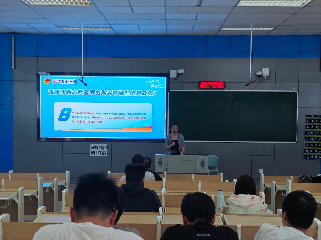 主讲人主要从西部计划政策相关问题、参与西部计划相关优惠政策以及如何上岸西部计划和招募条件几大板块进行宣讲。并鼓励大家积极响应团中央“到西部去、到基层去、到祖国和人名最需要的地方去”的号召。