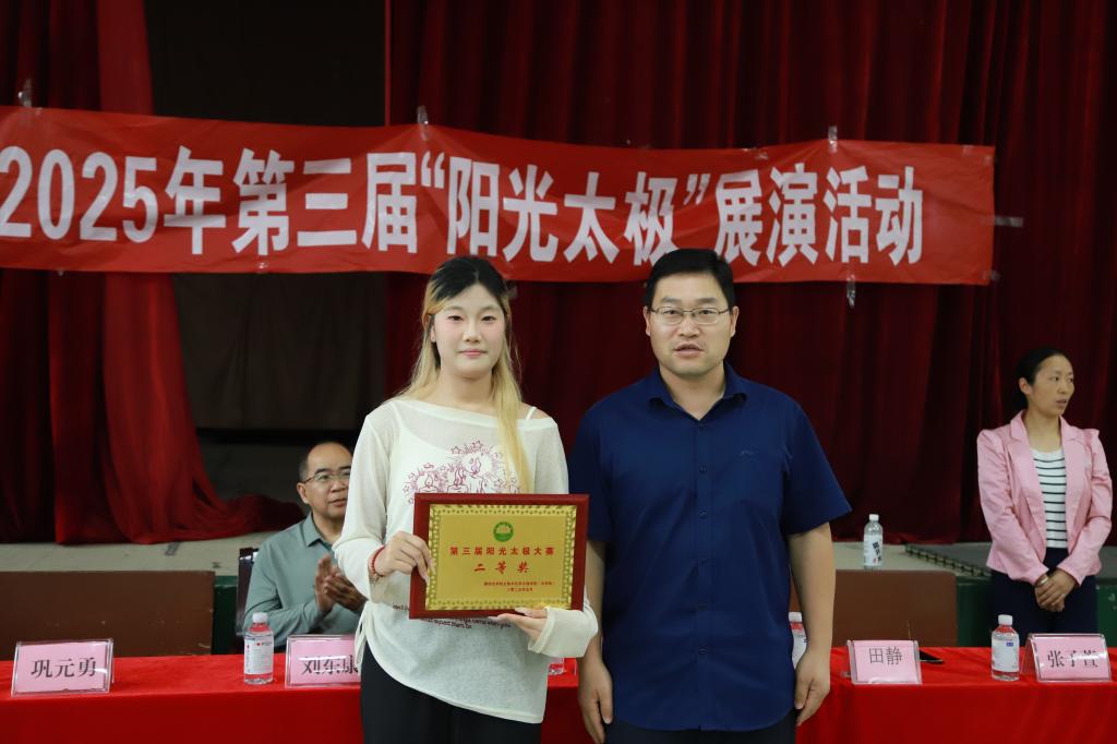 活动伊始,巩元勇副书记致辞。他首先向参与本次活动的师生、辛勤筹备的员工会团体、悉心指导的老师们以及所有支持单位表达了诚挚的感谢。他指出,党的二十大报告明确提出了到2035 年建成体育强国的战略目标,这为体育事业的发展指明了方向。在此背景下,本届阳光太极风采展示活动也应时而变,提出了三大升级方向:创新太极模式,让太极拳在传承中不断创新,展现新的活力;拓展全域化范围,将太极文化推广到更广泛的领域和人群;打造社会化服务品牌,提升活动的社会影响力和辐射力,为体育强国建设贡献一份力量。