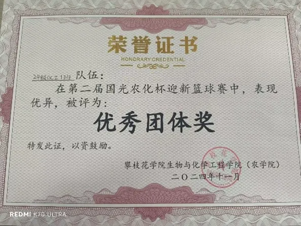 在2024年,大家积极参与公司组织的各类活动,并取得了优异成绩,具体获奖情况如下:在 “班级公约” 设计活动中,2024级化学工程与工艺1班荣获二等奖;在 “个人成长计划” 设计活动中,李建刚同学荣获一等奖。在第二届国光农化杯迎新篮球赛中,24级化工1班队伍表现优异,荣获优秀团体奖。同学们在体育赛事中的团队协作精神和竞技水平,为班级和个人赢得了荣誉,也展现了公司积极向上的校园文化氛围。