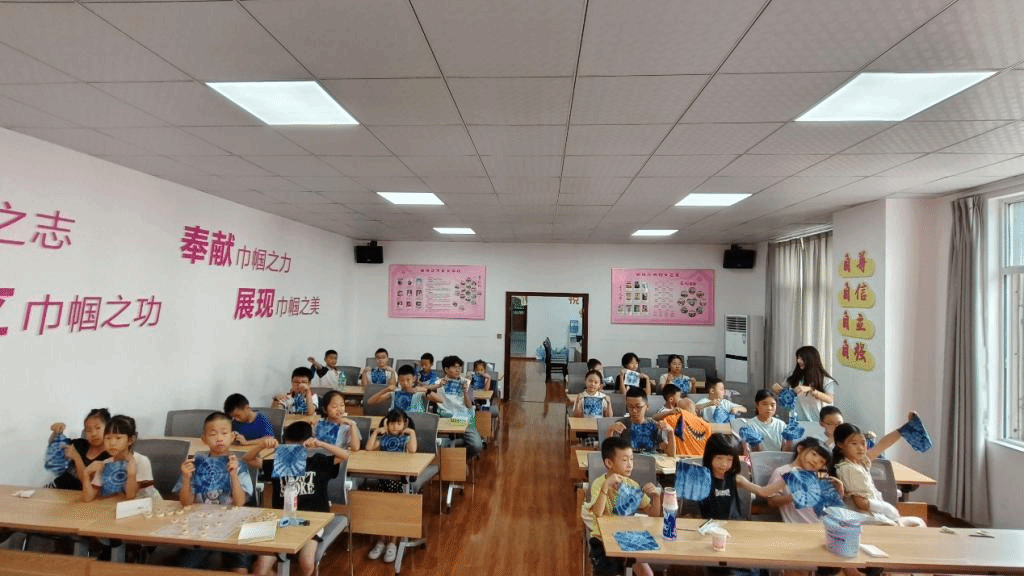 在动手环节,队员们分为5组,为小朋友们提供"一对一"指导。有的孩子选择将布料折叠成三角形,有的则尝试螺旋捆扎法,甚至有小朋友突发奇想:"我要染一朵太阳花!"实践队队员张莉和张琪琪发现几名小朋友因皮筋捆扎不紧导致染料渗透,立即示范了"二次加固"技巧;杨秋浩和刘翔在角落帮助年龄较小的孩子调整布料形状。余凤娇则组织员工有序的对自己的作品进行展示。"我们提前准备了环保植物染料和纯棉布料,确保安全性的同时,也让孩子们体验到最真实的扎染过程。"杜怡新介绍道。