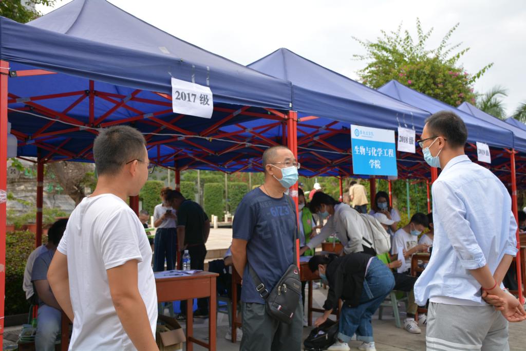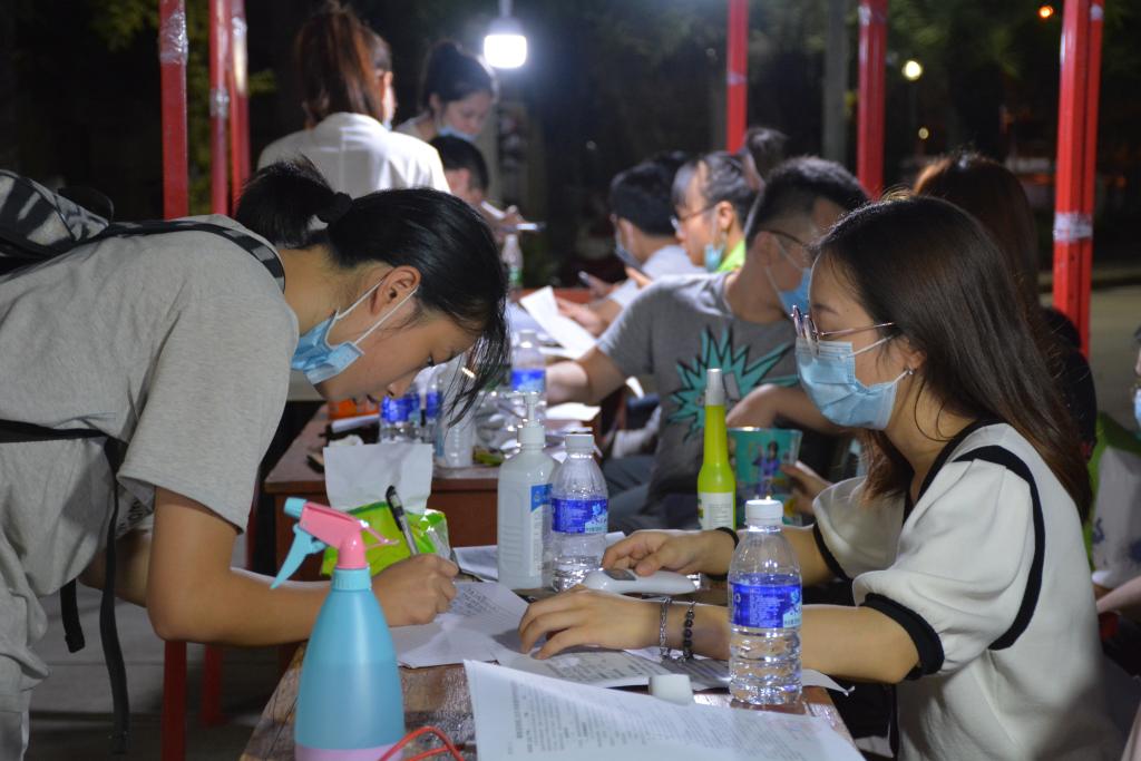 首先,志愿者在生化公司接待点等候,准备好口罩、消毒液、洗手液、雨衣等一系列防疫用品。志愿者的工作需要对到来的同学进行资料检查:健康码是否正确、健康卡、返校申请书和承诺书是否填写正确、测量员工体温并保存返校的各项资料。然后,服务点人员对到来的同学们表示欢迎和问候,提醒同学们在公司里要做好自身防疫工作,最后,叮嘱同学们回到寝室后,先休息好再整理卫生,并吃好晚饭,天气渐凉多添衣物,不要感冒,做好迎接新学期的准备。