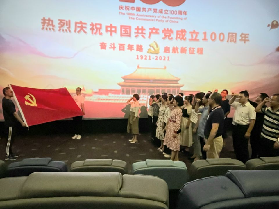 随后,教工支部组织开展主题党日活动。观影厅内,在支部书记的带领下,党员们面向党旗集体庄严宣誓,重温了入党誓词。支部通过组织观看庆祝建党一百周年重点电影《1921》的形式,对党员们开展了一次深刻的党史学习教育。