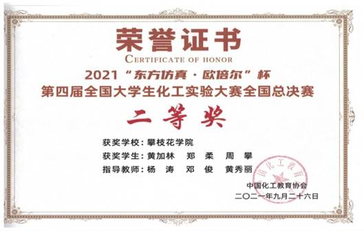 2021年9月24-26日,“东方仿真·欧倍尔”杯第四届全国老员工化工实验大赛全国总决赛在南京工业大学举行,因为疫情本届总决赛采用线上比赛形式。从全国六个赛区近300支队伍脱颖而出的77所高校参赛队伍在线上进行为期两天的激烈角逐。公司派出由yl23455永利集团(农公司)2018级化学工程与工艺专业黄加林、郑柔、周攀同学组成的“离谱队”代表yl23455永利集团参加比赛。团队在杨涛、邓俊和黄秀丽三位老师的精心指导下认真备赛,一路过关斩将晋级总决赛后在理论知识、仿真操作和实验操作三项环节均有优异表现,最终荣获总决赛二等奖的佳绩。