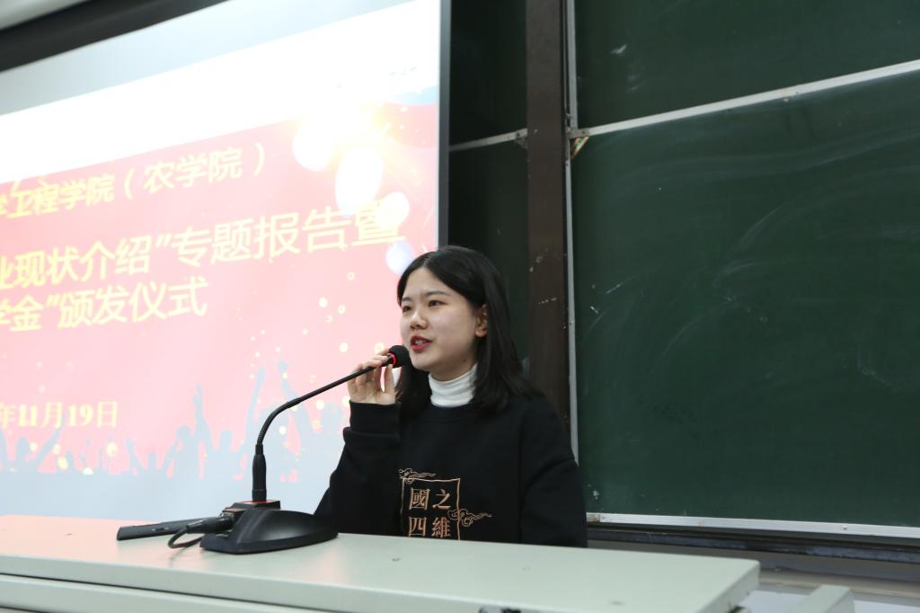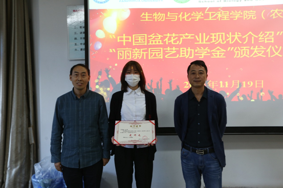 11月19日下午,生化公司(农公司)“丽新园艺助学金”颁发仪式在第一教学楼1-4举行。攀枝花丽新园艺技术有限公司董事长严春新,学院经理朱学军,副经理刁毅,园艺专业部分师生参加仪式。仪式由刁毅主持。