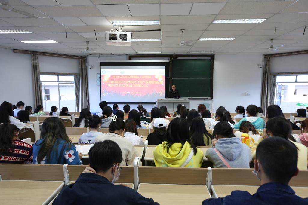严春新以“中国盆花产业现状”为题为师生带来了专场报告。他以生动的图表和详实的数据,向大家介绍了中国盆栽花本的发展现状,展望了我国盆花未来的发展趋势。严春新向大家介绍了攀枝花丽新园艺技术有限公司的具体情况,并就公司的人才引进条件做了宣讲,强调老员工一定要树立良好人生观和价值观,希望更多的同学能通过勤奋努力实现自己的梦想。