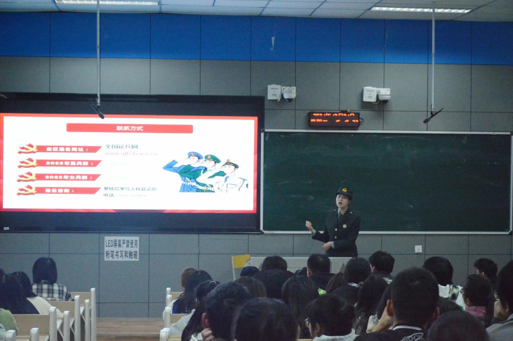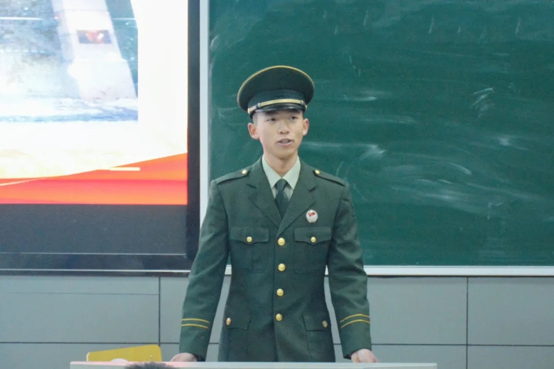 曾桂琴作为此次征兵的宣传者,她从“入伍条件”、“参军的基本流程”和“入伍的优惠政策”三个方面进行讲解。曾桂琴将参军的基本流程分为七步,简单明了的将流程阐述清楚,并为同学们介绍了入伍的优惠政策,它包含了保留入学资格或学籍、享受学费补偿和助学金贷款代偿、退役后享受升学优惠等优惠政策。曾桂琴介绍完后,魏浩南还讲述了他自己的当兵故事,使同学们更加了解入伍参军的生活。