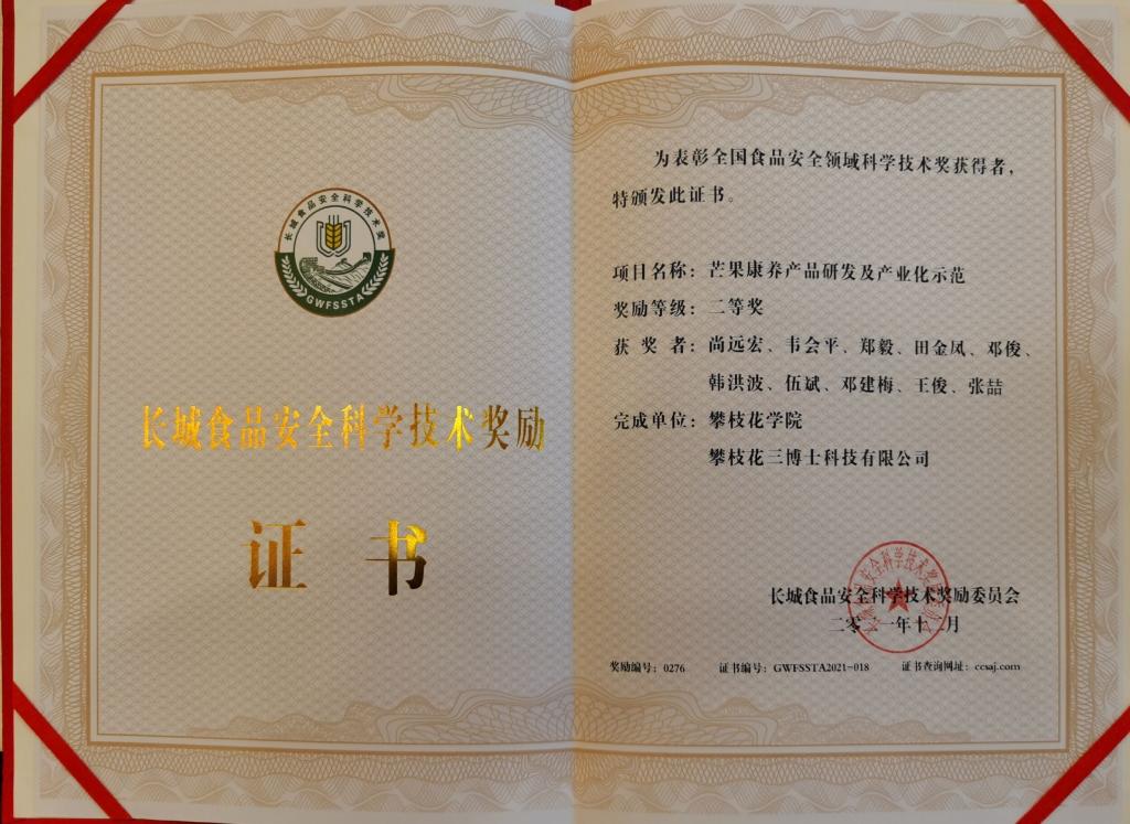 1月13日-14日,由中国食品报社、长城食品安全科学技术奖励委员会、中国食品药品企业质量安全促进会、北京食品学会主办的“第四届长城食品安全科学技术奖颁奖大会和第五届食安中国发展高峰论坛暨食品安全科技创新院士论坛”在昆明举行。公司申报的《芒果康养产品研发及产业化示范》项目荣获2021年长城食品安全科学技术二等奖。2021年长城食品安全科学技术奖设奖项24个,四川省仅有公司申报项目1项获奖。