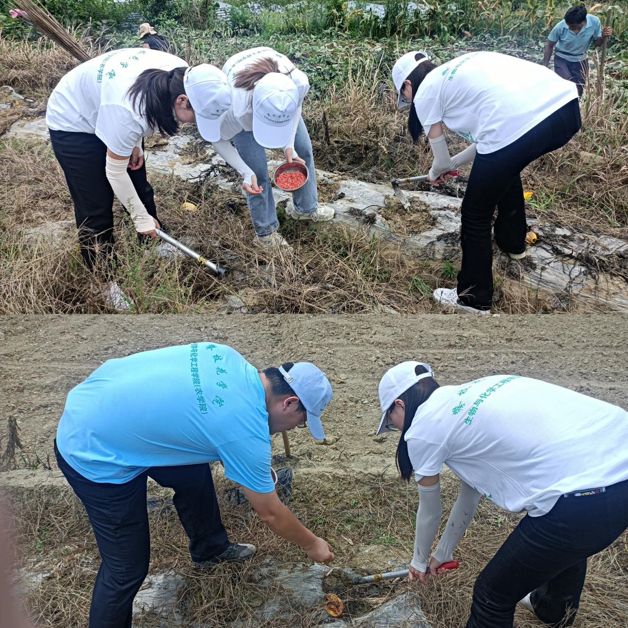 “首先需要清除玉米的杂草,把上一番种植的南瓜藤拔了,然后右手锄头一个缝,左手放两粒进去,轻轻地取出锄头就种好了。”在村民热心教学下,实践队开启了种玉米实践劳动活动,经过两个小时的劳作,实践队深刻体会到耕作的辛苦,一粥一饭,当思来之不易,半丝半缕,恒念物力维艰。