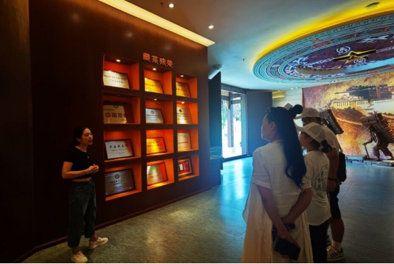 在讲解员的带领下,实践队来到藏茶村博物馆。据讲解员介绍,《四川通志》记载,早在公元前53年茶祖吴理真种茶蒙山,奠定了雅安“世界茶源”的历史地位。从此,生生不息、勤劳智慧的雅安人民为“世界茶文化”的发展作出了不朽的贡献。雅安藏茶就是浩瀚茶文化发展史上的一座丰碑,而藏茶,类属黑茶,雅安是黑茶生产的鼻祖。西藏,不宜植茶而常需;雅安,嘉木遍野而质优;雨城,善做藏茶而特供,故享“藏茶之乡”美誉 。