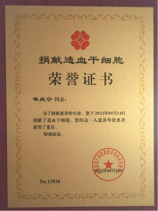 “这是莫大的缘分,才能与患者匹配成功。当患者父亲的感谢信通过红十字会工作人员转交给我时,字里行间都透露着父亲因女儿病痛的沧桑气息和感激之情,我自己也备受感动。真切祝愿患者早日康复!”韦庆宁说道。
