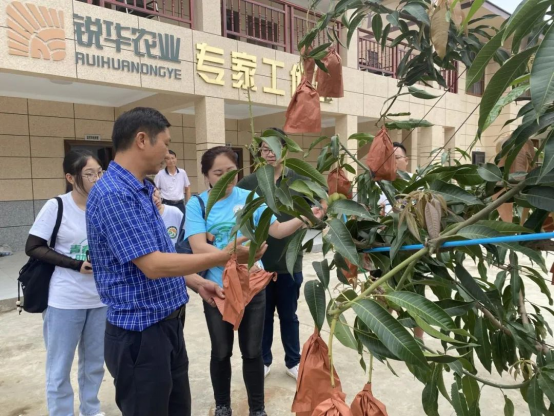 在社区工作人员的带领下,前往芒果现代农业园区,农业产业化国家重点龙头企业锐华农业进行参观,我们了解到公司以“公司+基地+专合组织+农户+品牌+市场”的产业化经营模式,辐射带动攀枝花万户农户发展特色水果产业增收致富奔小康。并且公司与中国热带作物研究院、四川省农科院等科研院所组建了专业稳定的科技研发和服务团队,形成了“优良品种→优质种苗→标准种植→科技服务→示范带动”的技术路线,不断创新,带动地区经济快速增长,并努力将金河村芒果产业打造为“三品一标”的产业,现在金河村的芒果产业已经实现了种植面积7500亩,年产值1.5万吨,收益达到1.04亿产值。金河村现在正在积极地探索新的产业蓝莓产业,而且在未来将倾力打造中国晚熟芒果示范基地。