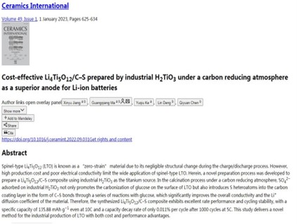 近日,公司与江西理工大学联合培养的生化公司2021级硕士研究生蒋鑫玉以第一作者在中科院SCI一区学术期刊《CERAMICSINTERNATIONAL》(影响因子5.532)发表题目为《Cost-effective Li4Ti5O12/C-S prepared by industrial H2TiO3 under acarbon reducing atmosphere as a superior anode for Li-ion batteries》的研究论文,公司马光强教授为通讯作者,江西理工大学柯于球副教授和公司陈啟原、邓林老师为共同作者。