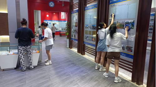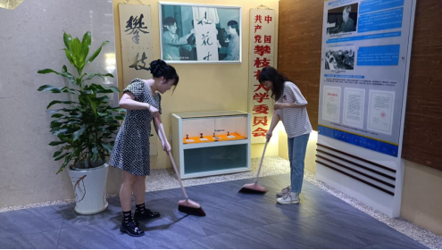 在校史展览馆工作人员的引导下参加活动的员工领取了打扫工具并分配清扫任务,大家各个精神饱满、态度积极,他们拿起抹布、水盆、扫帚、拖把等清洁工具,秩序井然的在校史馆中忙碌起来,扫地的扫地、拖地的拖地、擦拭的擦拭,不落任何一个地方,不留任何一个死角,地面清洁了,展柜明亮了,整个校史馆焕然一新。