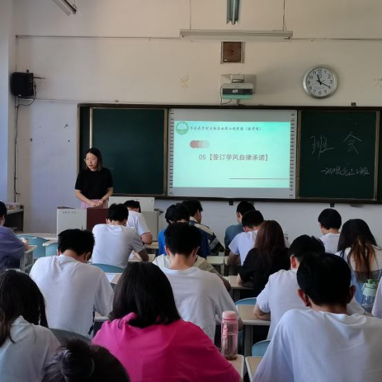 班主任解读公司学风自律承诺书,班级成员仔细阅读学习、生活、行为文明自律要求,签下学风自律承诺书,做自身文明行为的监督者、做学习自律的践行者。