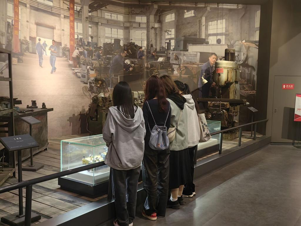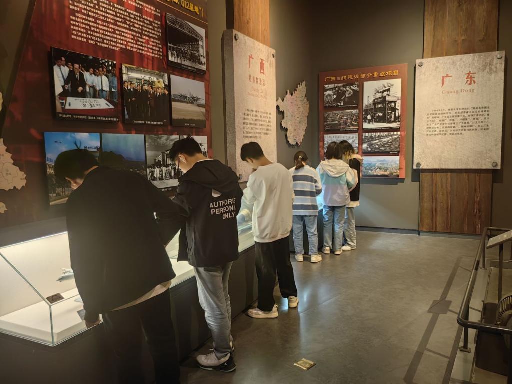 本次线下参观活动,各专业同学分批次有序入场,自主安静参观各个展厅。整个展陈以“铭刻峥嵘岁月,熔铸历史丰碑”为主题,由全国三线建设的历史背景、党中央的决策部署、十三省市区三线建设的展开情况等七大部分组成,全面展示和反映了中国三线建设的历史全貌。博物馆内,各种三线建设文物、文献史料、历史图片、珍贵视频资料;三线重点企业建造的航空、船舶、机械、交通、常规兵器;三线建设领导者、亲历者和研究学者的高清口述历史……卷帙浩繁的馆藏,似一本有品味的书,令同学们陶醉。展厅中描绘各行各业三线建设者的浮雕与雕塑,逼真还原的每一个场景似与当年的建设者的一次跨时空交流。三线建设已历时近60年,随着岁月的流逝,三线建设的贡献日益显现,三线建设者“艰苦创业,团结协作,勇于创新,无私奉献”的“三线精神”亦被广泛颂扬。