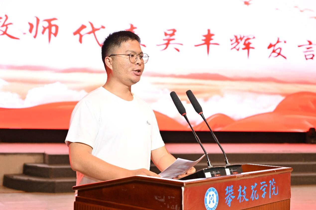 教师代表吴丰辉通过自己的学习经验寄语新生:在大公司园里,要明确学习目标和职业规划,培养良好的学习习惯,积极参加社会实践,保持积极乐观的心态。
