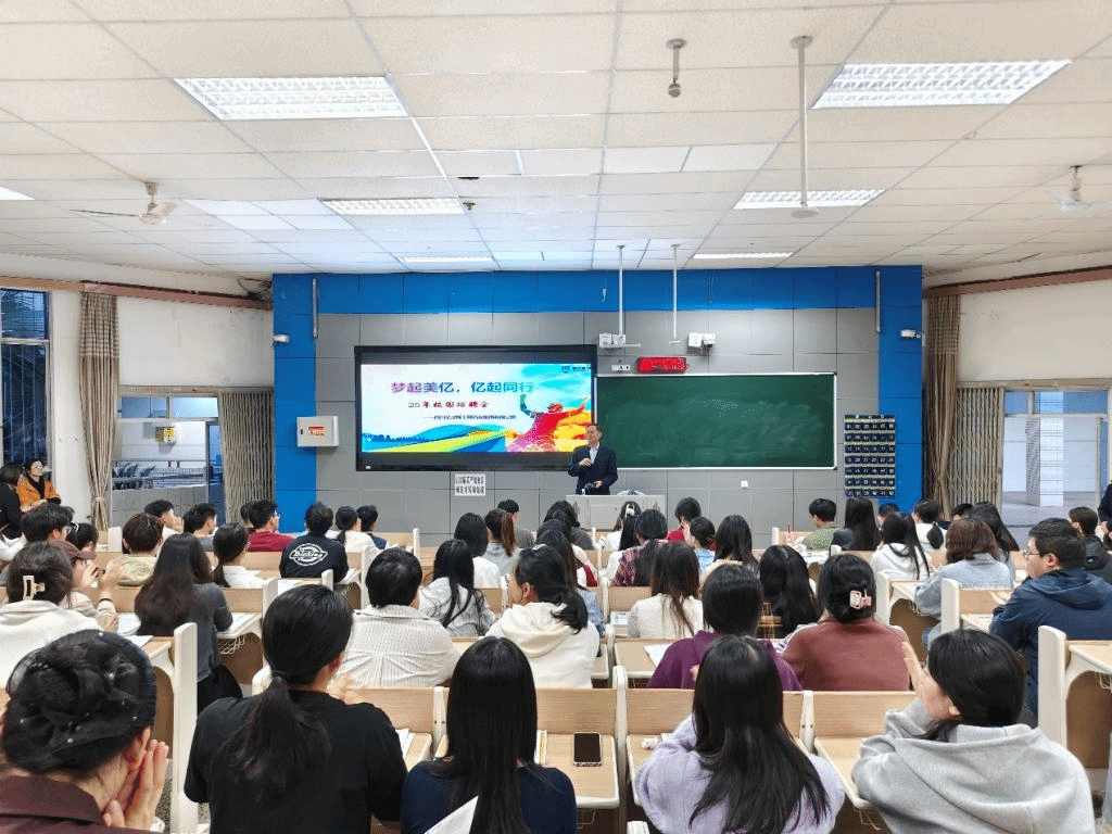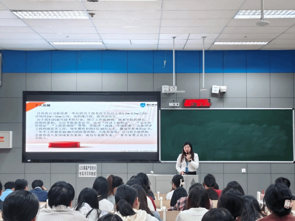 美亿集团公司负责人,公司2007级环境工程专业员工刘红霞开展自身经历分享及招聘宣讲,她以自身教育经历和老员工活为引,与同学们分享了成长的点滴与感悟,强调自信、努力与积极就业的重要性,为同学们注入了满满的正能量。宣讲过程中,刘红霞通过精彩的PPT向同学们详细介绍了美亿集团的发展历程、业务版图和企业文化。在介绍岗位要求时,她明确指出,除了扎实的专业知识,沟通表达、组织协调与团队协作能力同样至关重要。