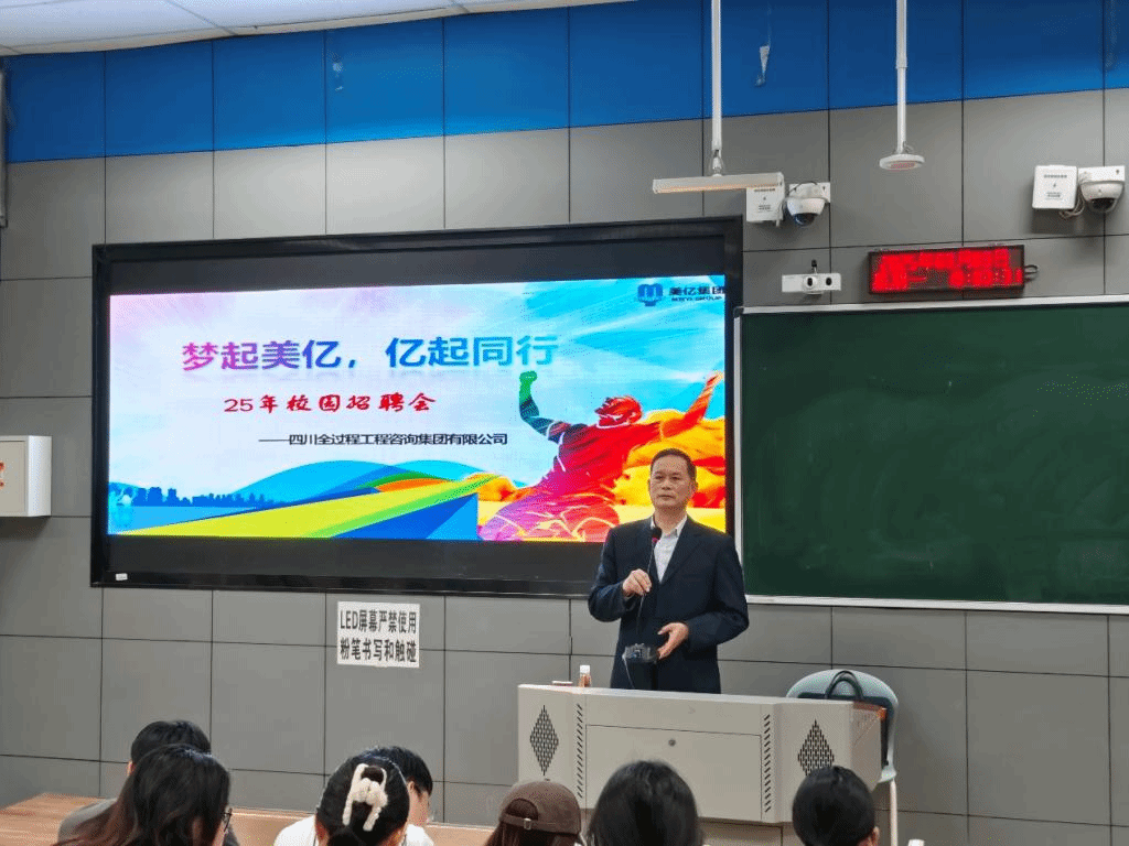 3月3日晚上,四川全过程工程咨询集团有限公司(简称“美亿集团”)在1-101举行校园招聘宣讲活动。公司招就处处长唐林、公司员工科科长巩元勇、公司负责人及2021级部分员工参加此次活动,巩元勇担任主持人。
