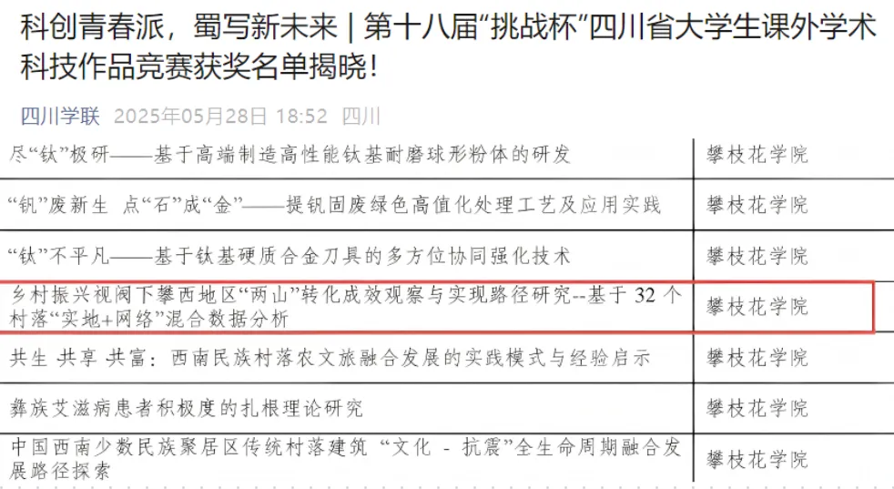 公司参赛团队凭借项目《乡村振兴视阀下攀西地区“两山” 转化成效观察与实现路径研究 —— 基于 32 个村落 “实地 + 网络” 混合数据分析》脱颖而出,经过初赛、复赛的层层筛选,成功晋级校级决赛,进入省赛环节,获得省级三等奖。