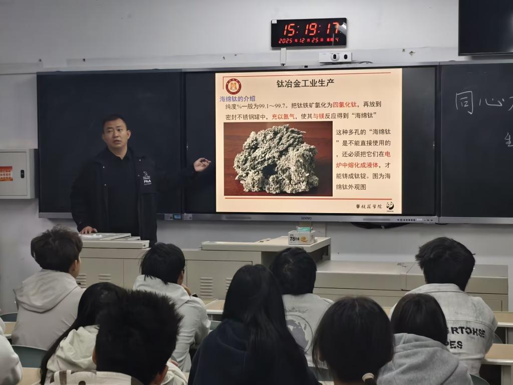 讲座中,李浩宇博士立足攀枝花市丰富的钒钛矿产资源优势,围绕钒钛冶金工业的全链条流程展开系统阐述。他指出,钒钛资源作为国家战略性矿产资源,广泛应用于钢材、航空、国防等关键领域,但其在我国多以共生矿形式存在,综合利用难度较大。针对这一现状,他详细介绍了钒铁、氮化钒等钒产品的电硅热法、铝热法生产工艺,以及钛白粉、海绵钛的硫酸法、氯化法制备技术,让师生对钒钛工业的核心生产环节有了清晰认知。